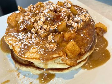 cinammon roasted apples, caramel sauce, granola, powder sugar