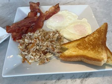 2 eggs any style, hash browns, bacon or sausage link, toast