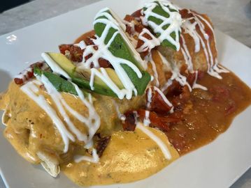 diced potatoes, chorizo, bacon, sausage, 2 scrambled eggs, smothered 1/2 green chile 1/2 queso sauce, sour cream, roasted habanero tomatoes
