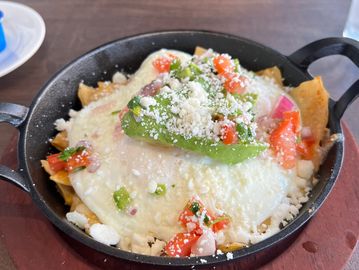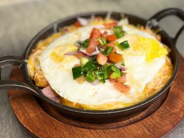 2 eggs any style, fried corn tortilla, salsa verde, crema, avocado, pico, queso fresco, mozarella cheese