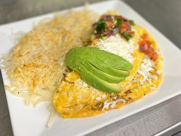 3 eggs, chorizo, roasted green chile, mozzarella cheese, pico, avocado, queso fresco, hashbrowns